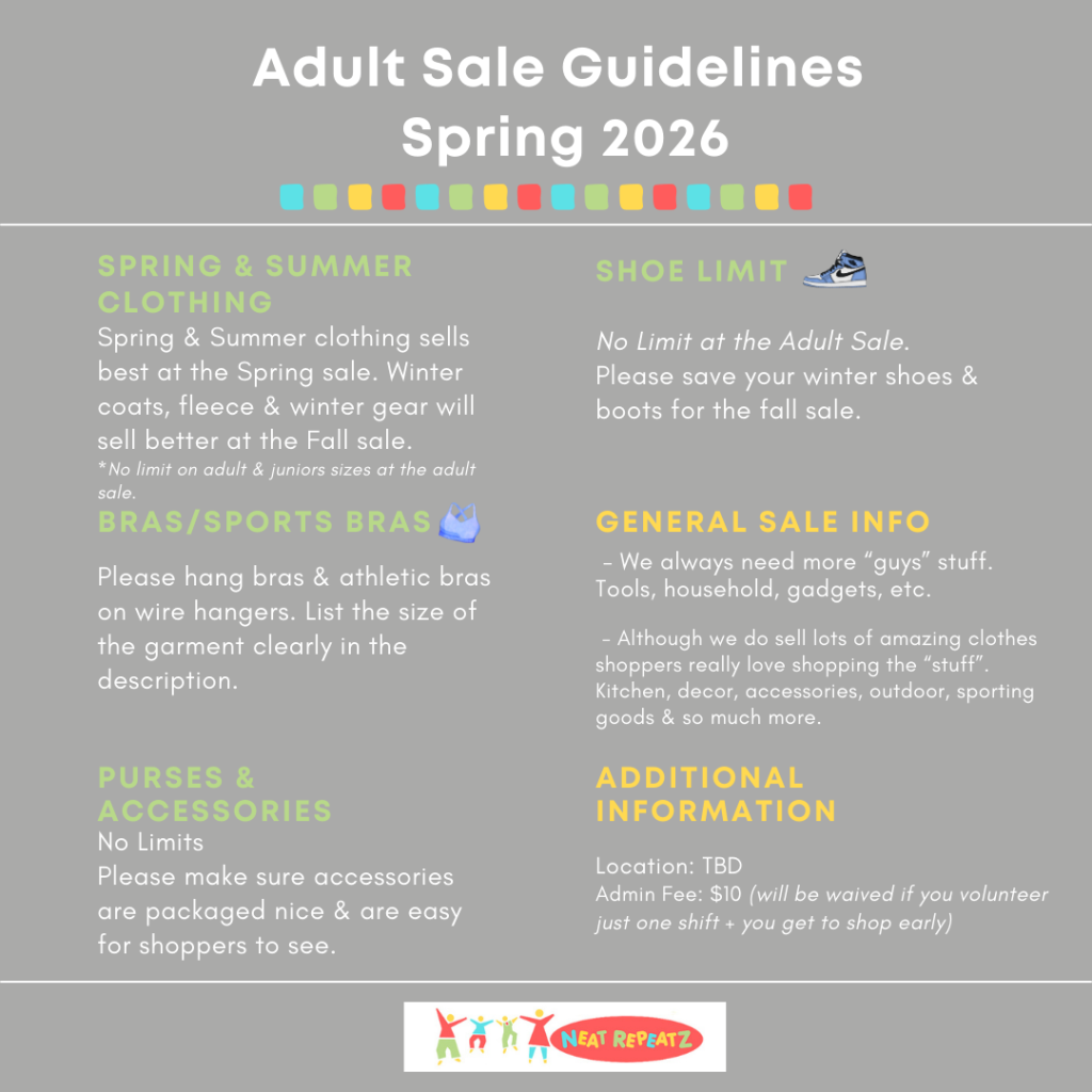 Children’s Sale- ALL things kids. Pregnancy through young adult, clothing, toys, shoes, books, sporting goods, baby, and so much more.